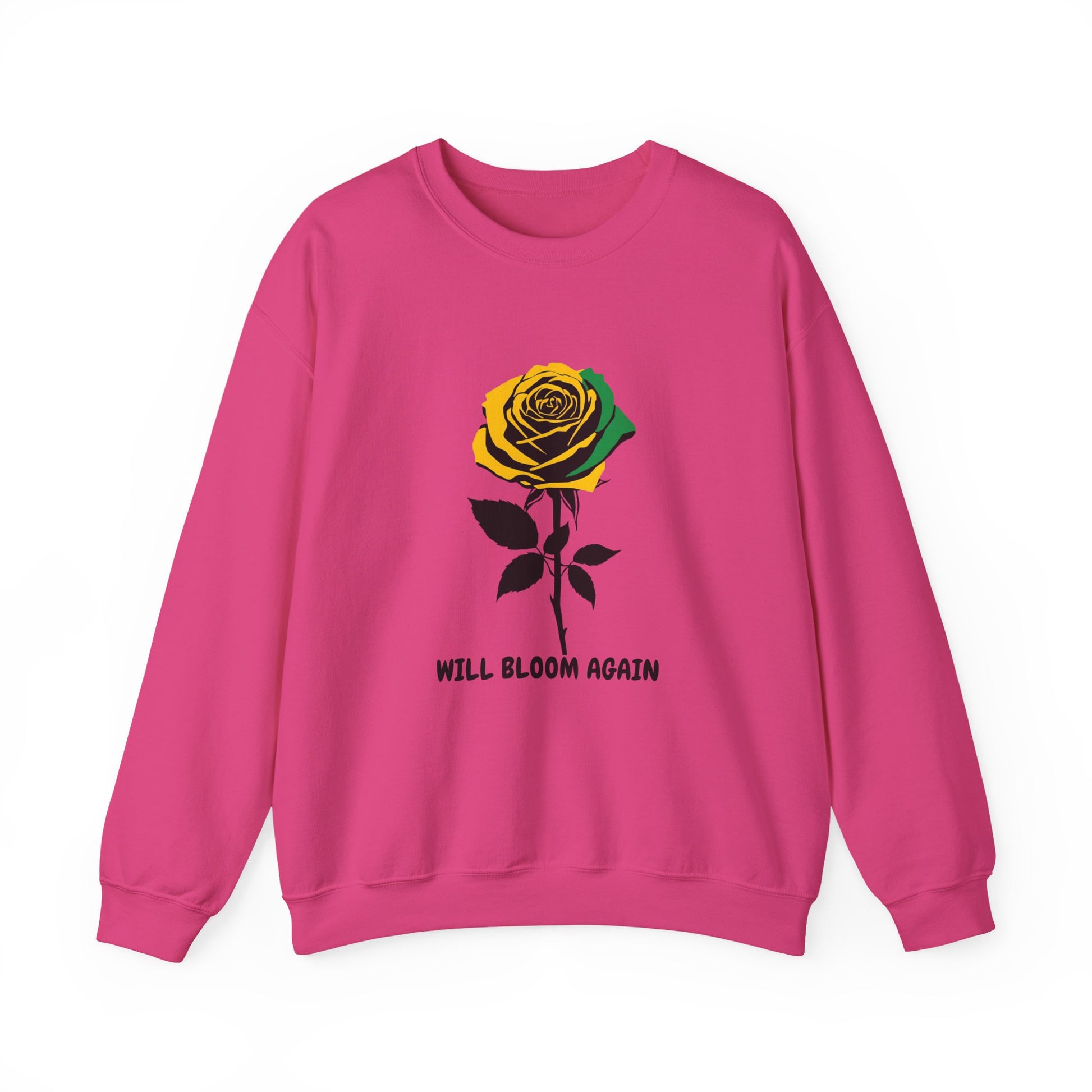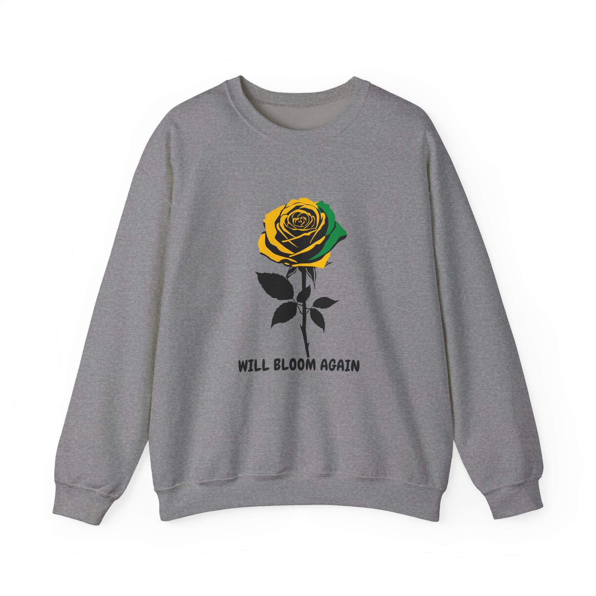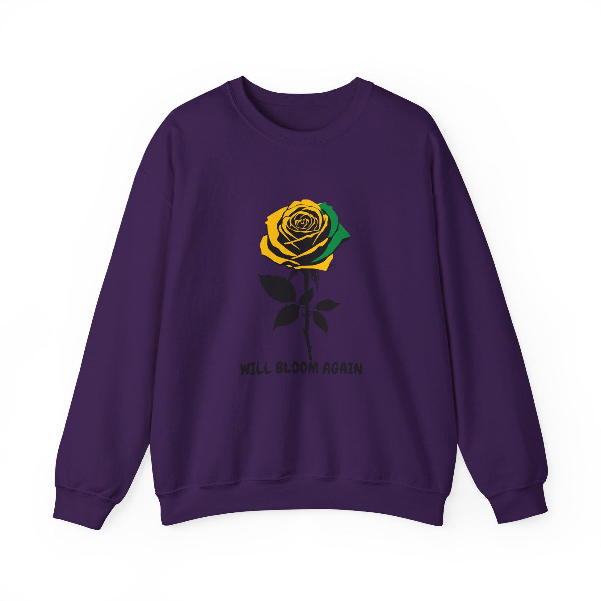 A single illustrated rose, shaded in warm gold and green and stark black leaves, punctuated with words “WILL BLOOM AGAIN” beneath it. The look reads like a personal promise: resilient, slightly vintage, and made to age with you. Comfortable ribbed cuffs and collar hold shape. Double-needle stitching at high-stress seams keeps it together through repeat wears and washes. Whether layered over a tee for slow mornings or worn out for evening walks, this sweatshirt is for the person who appreciates quiet symbolism and reliable comfort.