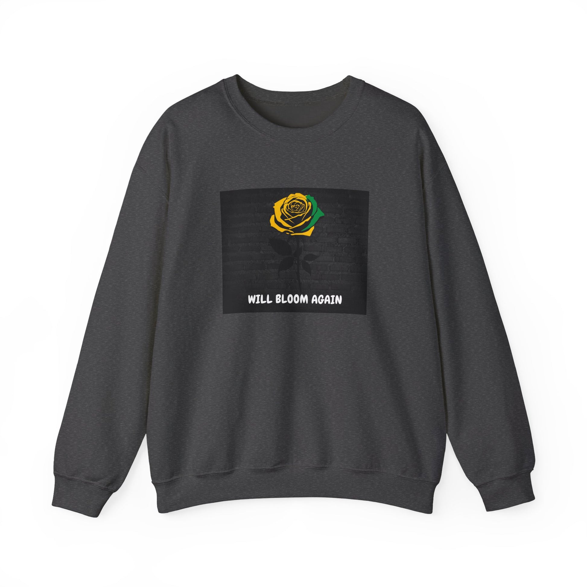 Soft, warm, and quietly hopeful — this crewneck wraps you in calm. A single yellow rose blooms against a matte black panel, with the subtle line “WILL BLOOM AGAIN” beneath. The medium-heavy 50/50 cotton-poly fabric and classic crew cut create a lived-in comfort that layers easily over tees or under coats. Gentle ribbed collar and cuffs hold their shape, while reinforced stitching keeps this sweatshirt ready for everyday wear. It reads like a gentle promise on a cool morning: steady, understated, and resilient.