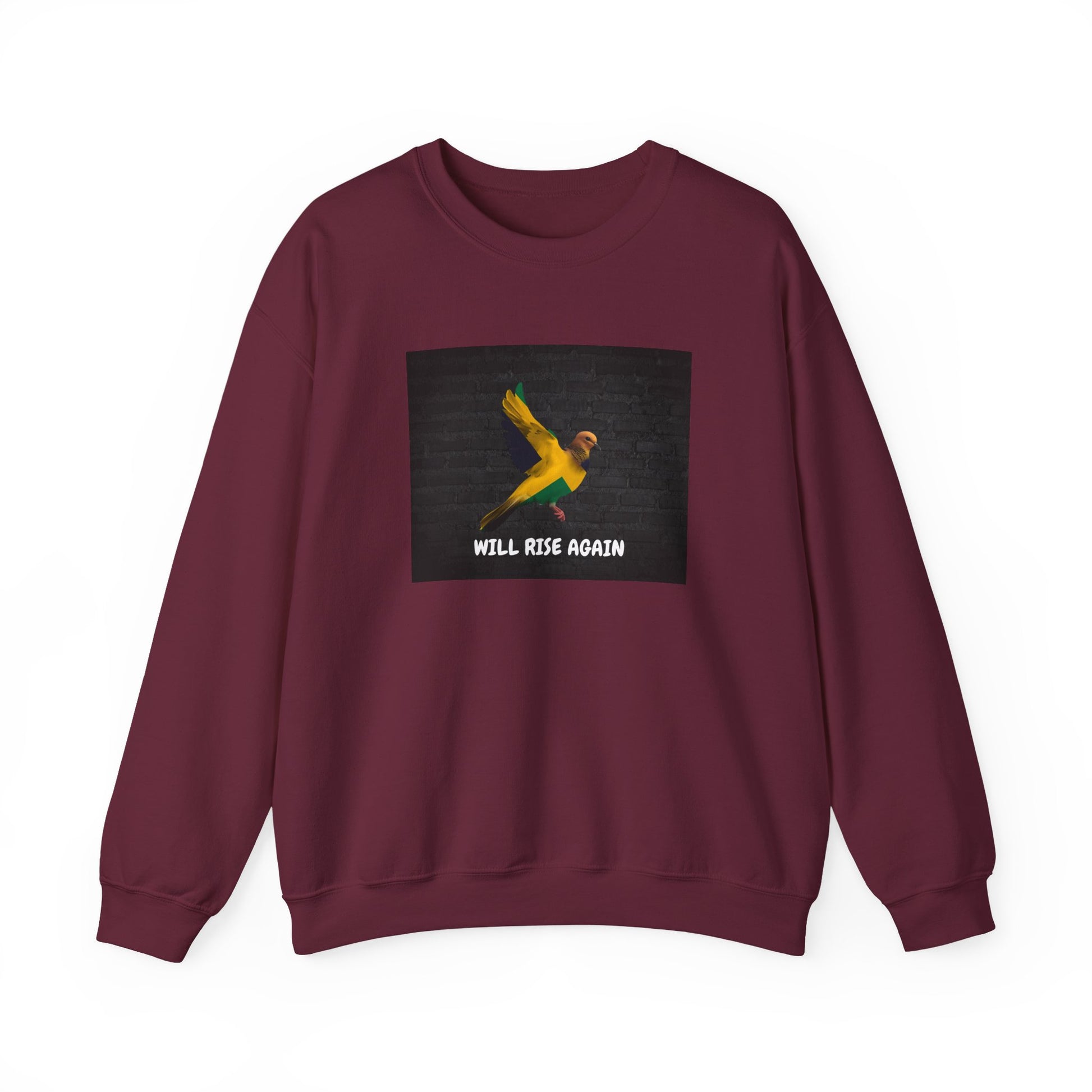 Soft, roomy, and quietly bold — this crewneck pairs everyday comfort with a small, meaningful statement. The front image of a rising bird and the understated caption “WILL RISE AGAIN” sits on a clean background, giving the sweatshirt a calm, hopeful energy. Wear it on slow mornings, during long city walks, or layered under a jacket when the weather turns. The medium-heavy cotton blend holds shape and warmth without feeling heavy, while the tubular knit and double-needle stitching keep the silhouette smooth and durable. It’s the kind of sweatshirt you reach for when you want to feel steady and quietly resilient.