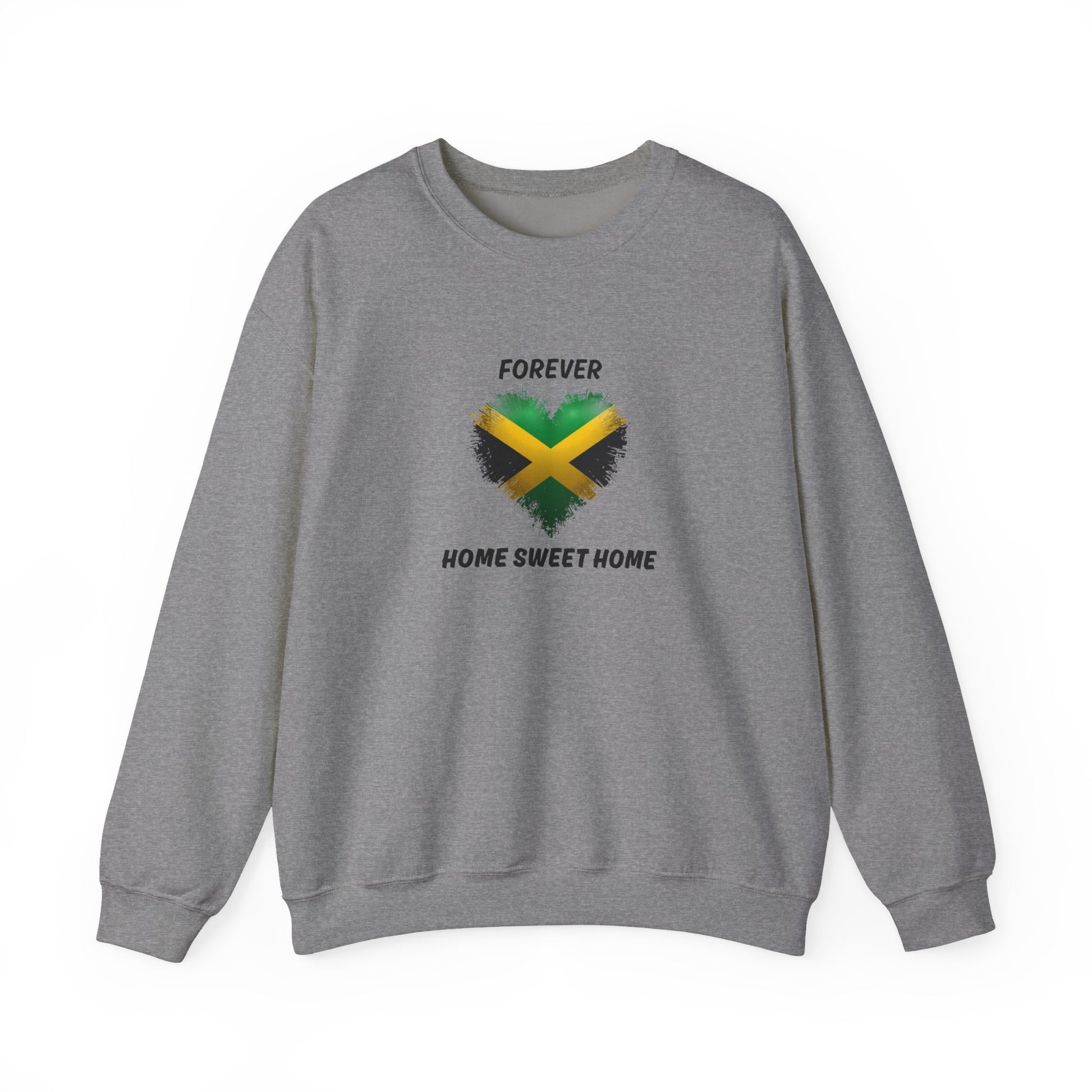 This cozy crewneck carries a quiet, heartfelt message: a painted heart in Jamaican colors with the words "Forever" above and "Home Sweet Home" below. The soft, medium-heavy blend feels substantial without being bulky, so it sits warm and familiar on cool mornings or late-night hangs. Wear it when you want to celebrate roots, reminisce on childhood streets, or keep a small piece of home close during travel. The subtle distressed heart graphic reads like a well-loved patch, the kind of thing that grows more meaningful with every wear. With clean lines and a classic fit, it layers easily beneath a jacket or stands alone as a bright, proud statement.