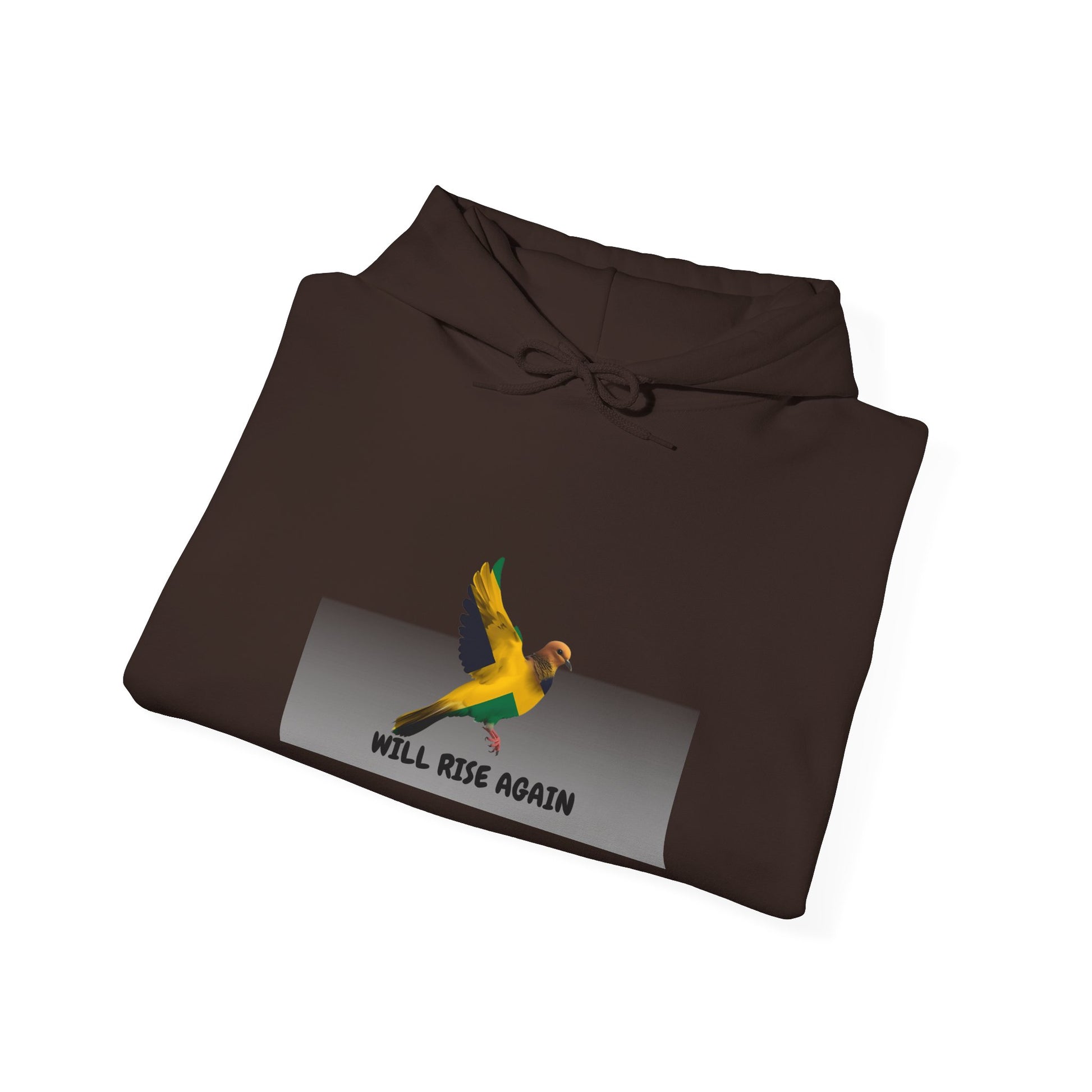 A soft, mid-weight hoodie with a subtle, hopeful graphic across the chest: a small yellow-green bird mid-flight above the words “WILL RISE AGAIN.” It feels like a quiet promise — the kind you pull on when you want comfort and a little courage. The roomy kangaroo pocket warms your hands. The double-lined hood and color-matched drawcord give the silhouette a clean, finished look. Wear it on slow mornings, late-night walks, or when you need a calm reminder that setbacks are temporary. The fabric blend keeps it cozy without feeling bulky, and printing methods preserve the image’s delicate tones for long-lasting wear.