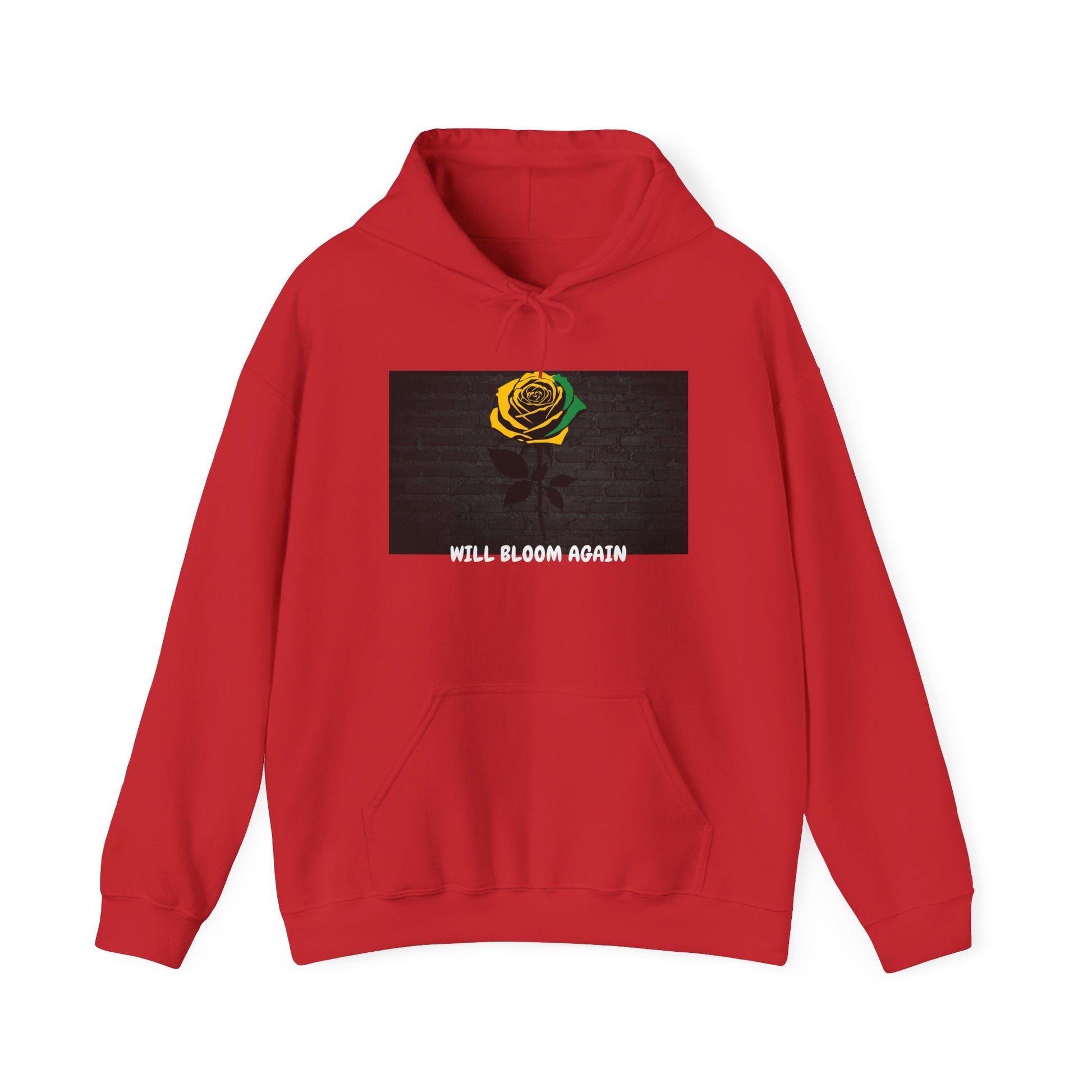 This heavyweight hoodie wraps quiet resilience in a simple, bold design. A single black-yellow-and-green rose rests above the words “WILL BLOOM AGAIN,” a small statement of recovery and quiet hope. The soft, brushed interior and roomy kangaroo pocket make it a go-to layer for slow mornings, late-night walks, or when you need a wearable reminder that seasons change. Clean lines, muted print, and a double-lined hood keep the focus on the message — subtle, steady, and earnest.