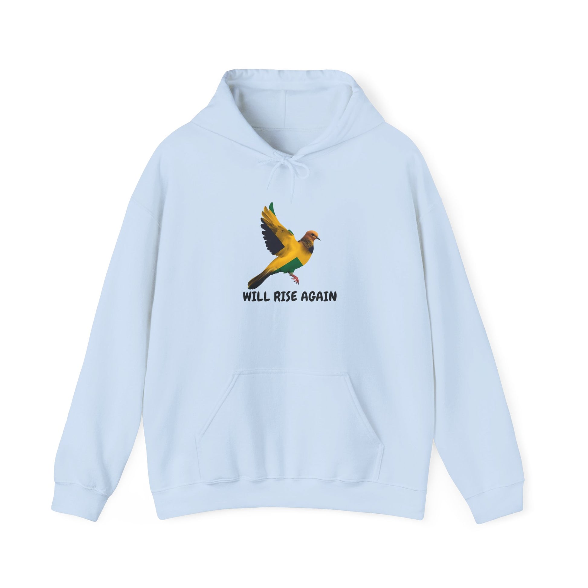 Soft, roomy, and quietly hopeful — this hoodie carries a small, bright bird mid-flight with the words “WILL RISE AGAIN” beneath. It’s the kind of piece you pull on when mornings feel heavy and you need a gentle reminder that movement and healing are possible. The double-lined hood and color-matched drawcord give it a clean, finished look, while the kangaroo pouch keeps hands warm and gives a place to tuck away small comforts. Breathable yet warm, the fabric blend stays resilient through wear and washes, and printed/embroidered options let the uplifting motif sit either subtly over the heart or proudly centered. Wear it at home, on a quiet walk, or layered for a reflective meet-up — it’s a soft, wearable nudge toward brighter days.
